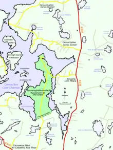 The townland lies on a low, boggy peninsula in Camus Bay and can be reached by turning west from the R336 road at Cinn Mhara, or by going northwest on the R374 road out of Casla, then turning onto Bóthar na Scratóg and going north.[10]