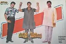Mugguru Monagallu (transl.โ€‰Three courageous men) is a 1994 Indian Telugu-language action comedy film directed by K. Raghavendra Rao and produced by Chiranjeevi's younger brothers Nagendra Babu and Pawan Kalyan. This film stars Chiranjeevi in a triple role, Ramya Krishna, Nagma and Roja. The music and background score were composed by Vidyasagar. The film was released on 7 January 1994.[1] This movie is dubbed in Hindi as Trishul