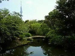 Mukōjima-Hyakkaen Garden with Tokyo Skytree in the background