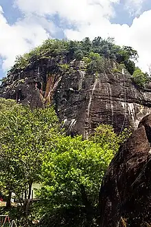 Mulkirigala Raja Maha Vihara (also known as Mulgirigala Raja Maha Vihara) (Sinhala: මුල්කිරිගල රජමහා විහාරය) is an ancient Buddhist temple in Mulkirigala, Sri Lanka. It has been built on a 205 m (673 ft) high natural rock, surrounded with another four rocks known as Benagala, Kondagala, Bisogala and Seelawathiegala. The temple site is located about 2 km (1.2 mi) from the Mulkirigala junction and can be reached from either Dikwella or Tangalle towns. The temple has been formally recognised by the Government as an archaeological site in Sri Lanka. The designation was declared on 8 April 1988 under the government Gazette number 501.[1]