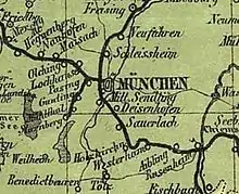 The Munich–Holzkirchen line was built as a part of the Bavarian Maximilian's Railway along with the Munich-Rosenheim section of the modern Mangfall Valley Railway. The section between Munich and Rosenheim was designed between 1840 and 1850. The first section from Munich to Hesselohe was built from 1845. The continuation to Rosenheim was originally proposed to go via Glonn and Kirchdorf am Haunpold. After it was approved in 1850, the line was finally built via Holzkirchen. This route modified the plans of 1850 by Joseph Anton von Maffei for the Munich-Rosenheim-Salzburg Railway Company (München-Rosenheim-Salzburger-Eisenbahn-Verein) in order to run closer to the Miesbach coalfields. Construction of the Großhesselohe Bridge began in 1851. When it was opened it was the second highest railway bridge in the world. In 1852, the Bavarian State became responsible for its funding, because the company had got into financial difficulties. The line was completed all the way to Rosenheim in 1857. With the opening of the shorter Munich–Rosenheim railway via Grafing in 1871, the line had less traffic. In 1891, the line was crossed by the Isar Valley Railway that paralleled the Isar river. In 1968 the line was electrified.[2][3][4] In 1981, Großhesselohe station was closed, after several renovations, as the Isar Valley Railway with its Grosshesselohe Isartal station had been fully integrated in the Munich S-Bahn network.