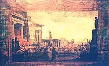 The stage curtain of the new theatre was inherited from its predecessor, Teatro di San Giacomo, and was created by an Italian artist.[1] It depicted a scene from the Odyssey where Odysseus was welcomed by King Alcinous to the land of the Phaiakes.[1]