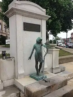 The Murphy Memorial Drinking Fountain is located in Delphi, Indiana on the southwest corner of the Carroll County Courthouse at Main and Market Streets and owned by the City of Delphi. The fountain was created in 1918 by Indianapolis-based Blakley Granite, Marble and Tile Company in collaboration with the artist Myra Reynolds Richards. Blakley created the architectural elements and Richards created the figural sculpture of the young girl located in the center. Originally there were two drinking fountains contained within the granite chalices on either side while the sculpture had a minor feature that may have bubbled water out of the chalice that the child holds with her right hand.