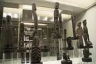 Level 0 permanent gallery. Clockwise from upper left: Statue of Sequana in a duck-shaped boat, an array of ex-votos in oak wood, a stylized bronze plating of male genitalia, a Gallic stele of a figure holding a candle.