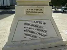 A commemorative plaque was placed at the base of the monument. This plaque was previously located nearby at the Beer Sheva War Cemetery for British and ANZAC soldiers who died in the same battle.