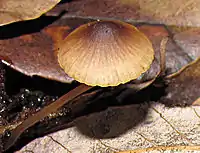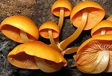 The cap of M. aurantiomarginata ranges in shape from obtusely conic to bell-shaped, and becomes flat in maturity, reaching diameters of 0.8–2.0 cm (3834 in). The cap color is variable, ranging from dark olive fuscous (dark brownish-gray) to yellowish-olive in the center, while the margin is orangish. Alexander H. Smith, in his 1947 monograph of North American Mycena species, stated that the caps are not hygrophanous (changing color depending on the level of hydration),[13] while Mycena specialist Arne Aronsen says they are.[14] The overall color fades as the mushroom ages.[15] The surface is moist, and young individuals are covered with fine whitish powder, but this soon sloughs off to leave a polished surface that develops radial grooves in maturity.[13] The flesh is thin (about 1 mm thick in the center of the cap) and flexible.[15]