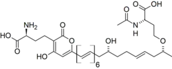 In 2010, a pigment compound isolated and characterized from fruit bodies of Mycena aurantiomarginata was reported as new to science by Robert Jaeger and Peter Spiteller in the Journal of Natural Products. The chemical, mycenaaurin A, is a polyene compound that consists of a tridecaketide (i.e., 13 adjacent methylene bridge and carbonyl functional groups with two amino acid moieties on either end of the molecule). The authors posit that the flanking amino acid groups are probably derived biosynthetically from S-Adenosyl methionine. The tridecaketide itself contains an alpha-pyrone, a conjugated hexaene, and a single alkenyl moiety. Jaeger and Spiteller suggest that mycenaaurin A might function as a defense compound, since it exhibits antibacterial activity against the Gram-positive bacterium Bacillus pumilus. The chemical is only present in the fruit bodies, and not in the colorless mycelia.[29] An earlier screening for antimicrobial activity in the fruit bodies revealed a weak ability to inhibit the growth of the fungi Candida albicans and Aspergillus fumigatus.[30]