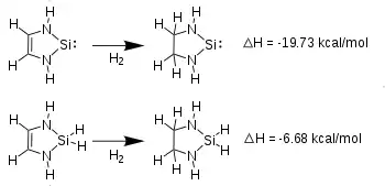 The structural differences, distinct reactivity, and increased stability of the unsaturated ring is attributed the olefinic C=C bond which creates a 6π aromatic ring with the two nitrogen lone pairs. The Si-N bond length discrepancy mentioned above is a strong indication of π delocalization. In proton NMR the vinylic protons resonate at 6.75ppm for [tBuN−CH=CH−tBuN]Si: versus 5.73ppm for the tetravalent dichloride starting material or 6.00ppm for the tetravalent NHSi-H2 dihydride. In the tetravalent species, the lack of the silicon's empty 3p orbital breaks the π ring, causing an upfield shift as the deshielding due to aromatic ring current is lost.[2] Additionally there are significant discrepancies in the Raman spectroscopy signals between the unsaturated NHSi and tetravalent silicon analogues, such as NHSi-Cl2 and spiro-[tBuN−CH=CH−tBuN]2Si. The four-coordinate silanes exhibit C=C stretches at 1620 cm−1. Conversely [tBuN−CH=CH−tBuN]Si:'s C=C resonance is found bifurcated at 1566 cm−1 and 1573 cm−1 at a much greater intensity. In the divalent species, electron density is shifted out of the C=C bond into the ring and empty Si 3p orbital, weakening the C=C bond and causing the observed energy drop and shape change in the C=C resonance.[6]