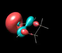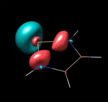 Computational studies and photoelectron spectroscopy create a more nuanced picture of electronic structure and π-electron sharing in NHSis. Relevant π bonding orbitals in unsaturated five-membered NHSis can be understood as the molecular orbital mixing of the diimine backbone's butadiene-like pi orbitals and the 3s and 3p orbitals of Si. Photoelectron Spectra of the unsaturated [tBuN−CH=CH−tBuN]Si: show a HOMO with three peaks at -6.96eV, -7.13eV & -7.28eV, assigned the in-phase overlap of the Si 3py orbital and buta-1,3-diene-like π3 of the diimine. The HOMO in the tetravalent Si-hydrogenated analog lacks a vacant Si 3py orbital and the energy of the π3 is destabilized to -6.56 eV, supporting charge donation from N to Si in the silylene. The HOMO-1 is the in-plane Si lone pair involved in σ donation. No difference is calculated between the HOMO-2 for the unsaturated silylene compared to the corresponding orbital of the silane analog. The original 1994 Denk at al. photoelectron spectroscopy communication relates this orbital to the π2 diimine orbital, however a 1996 paper from Blakeman et al. designates this as the nitrogen lone pairs. Either way, both orbital assignments are symmetrically forbidden from overlapping with any Si orbital. The HOMO-2 does not change in energy upon hydrogenation at Si indicating that much of the overall electronics are unchanged by hydrogenation and underscoring the effects of N to Si electron π-donation in the HOMO and HOMO-3. Calculations in the former study at the MP4 6-31G* level showed increased energy level spacing for N-H model compounds (instead of N-tBu), but with the same order and proportional spacing.[5][9] The Blakeman study compared the benzo-fused NHSi to the ethylene-like unsaturated NHSi, and found by PES that the HOMO is lower by .36eV and the Si lone pair by .34 eV in the benzo-fused NHSi, suggesting the electron withdrawing power of the phenylene ring makes the benzo-fused NHSi less nucleophilic.[9]