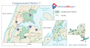 Like many Congressional districts around the country, the New York Seventh's boundaries were drawn as to link disparate and widely separated neighborhoods with a large percentage of minority voters (see majority-minority districts). While no minority in the district constitutes an absolute majority, the boundaries group together heavily Puerto Rican neighborhoods in the New York City boroughs of Brooklyn and Queens.