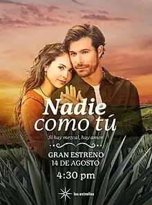 Nadie como tú is a Mexican telenovela produced by Ignacio Sada Madero for TelevisaUnivision. The series is based on the 2010 Portuguese telenovela Espírito Indomável, created by Sandra Santos.[2] It premiered on Las Estrellas on 14 August 2023.[3] The series stars Eduardo Santamarina, Karla Esquivel, Brandon Peniche, Diego Olivera, Alejandra Barros, Irina Baeva, Iván Arana and Elizabeth Álvarez.[4]