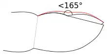 - Mild clubbing - Loss of the normal <165° angle (Lovibond angle) between the nailbed and the fold (cuticula). Schamroth's window (see below) is obliterated. Clubbing is not obvious at a glance.