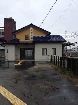 The station has one ground-level island platform serving two tracks, connected to the wooden station building by a level crossing. The station is staffed on weekdays.