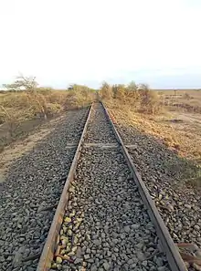 A metre gauge railway line was laid in 1980 to connect the town with Bhuj. Passenger and freight trains ran on it from Naliya railway station to Bhuj. The track was abandoned later after Gandhidham-Bhuj section was converted to broad-gauge and this 101.52 km railway line became isolated. Gauge conversion to broad gauge was approved by the government in 2008.[7] The gauge conversion of 28 km was completed up between Bhuj and Desalpur in 2018. The work in remaining 74 km is in progress.