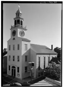 The oldest buildings within the historic district date from the late 17th century. Built mostly of wood, they are utilitarian in style with little ornamentation or detail. In the period that followed the American Revolution, with the rise in whaling wealth, more ornate buildings were constructed by sea captains and merchants in the Federal style. Among these is the Second Congressional Meetinghouse, built in 1809. The most outstanding buildings are situated on Main and Orange Streets, such as the Hadwen-Wright House at 94 Main Street. Immediately following the devastating fire of 1846, the entire commercial district was rebuilt with new two and three-story brick buildings.[7] The rebuilt area is dominated by the predominant Greek Revival style of the 1840s.[8]