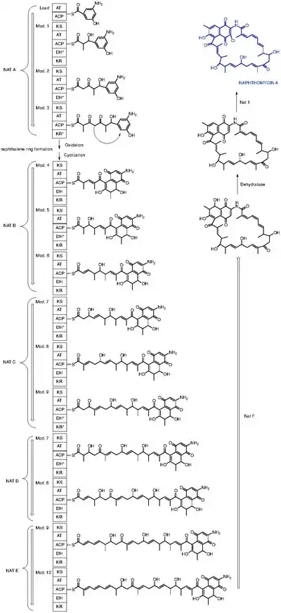 The proposed naphthomycin biosynthetic pathway.[5] A, adenylation; KS, ketosynthase; AT, acyltransferase; T, acyl carrier protein or peptidyl carrier protein; DH, dehydratase; KR, ketoreductase; (*) redundant domain.
