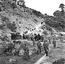 In March 1959, Das, along with five of his colleagues and a sectional commander, were directed to get to the international border to escort Tenzin Gyatso, the 14th Dalai Lama in order to welcome him in India. The monk, then 24, at the onset of the 1959 Tibetan uprising had fled Tibet and undertaken a 13-day trek disguised as a soldier to escape Chinese armed forces.[1] Das and his unit started from Lumla where he was posted as a rifleman with the ninth platoon of the Assam Rifles to move towards Shakti, a point along the India-Tibet border. He would later recount that the unit was woken at 3 am and asked to pack their lunch and go to Shakti.[2] The unit reached Shakti with .303 British Enfield rifles to escort the Dalai Lama and 20 of his guards on yaks and horseback.[2] Guards from the ninth platoon of the Assam Rifles had earlier brought the Dalai Lama from Zuthangbo to Shakti.[3][4] The Dalai Lama was granted a reception in Lumla before being escorted further to Tawang in Arunachal Pradesh.[2][5] He received a guard of honour from the Assam Rifles in Tawang before going to Bomdila.[3]