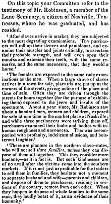 The subject of one slave narrative interview conducted by Fisk University staff in the 1920s stated, "There was a sale block where they carried the Negroes there and auctioned them off. Right where that old building is now, those Irishmen got rich selling Negroes to white folks."[9] Another man told the interviewer that he had been sold four times in his life and recalled of the slave markets, "You could see the women crying about their babies and children they had left."[9] A third recalled that her mother was sold in Nashville, to buyers who lived in another state.[10] A centenarian named Millie Simpkins interviewed by the WPA Slave Narratives project told her experience:[10]
