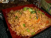 Nasi goreng (/ˌnɑːsi ɡɒˈrɛŋ/; Indonesian pronunciation: [ˈnasi ˈɡorɛŋ]) is a Southeast Asian fried rice dish, usually cooked with pieces of meat and vegetables. One of Indonesia's national dishes,[1][2] it is also eaten in Malay-speaking communities in countries such as Malaysia, Singapore and Brunei, and has gained popularity in Sri Lanka through migrations from the Indonesian Archipelago,[3] in countries like Suriname via Indonesian immigrant communities,[4] and in the Netherlands through its colonial ties with Indonesia.[5] Nasi goreng is distinguished from other Asian fried rice preparations by its distinct smoky aroma, and caramelised yet savoury undertones of flavour. There is no single defined recipe for nasi goreng, and its composition and preparation varies greatly from household to household.
