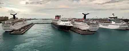 Prince George Wharf in Nassau Harbour. Ships from left to right are Carnival Fascination, Disney Magic, Carnival Sensation, and Majesty of the Seas.