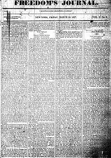 African Americans determined to speak out against this hate, and to set the record straight for their race, started their own newspapers and publications. They worked to paint blacks in a more positive light and to protest their position in the country.[3] The first African American Newspaper to be launched in the United States was Freedom's Journal in 1827.[5] It provided information on international, national, and regional current events. The editors of Freedom's Journal voiced their concerns on racial attacks towards African Americans.[5] Freedom's Journal also worked to promote the importance of literacy into African American communities so they would see the value of reading and writing.[5] Despite the illiteracy rates of blacks at this time, it is believed that more than 1,184 black papers were started from 1865 to 1900, with more than 150 that were instituted in 1890 alone.[4] This surge in African American newspapers caused black editors to come together and create their own National Afro-American Press Association.[4]