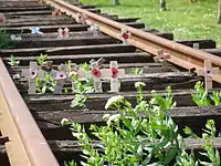 The memorial is constructed from 30 metres of the original rails and sleepers used on the Burma Railway, which were brought to the arboretum from Thailand in HMS Northumberland in 2002. The memorial is a permanent tribute to those who were forced to construct the infamous ‘Railway of Death’ and the benches and trees around the railway track have relevant dedications. The memorial was dedicated on 15 August 2002.[16] |