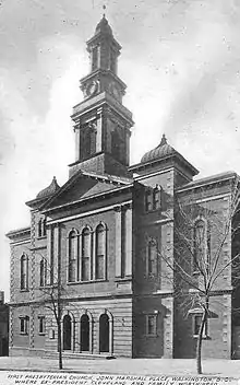 Officially organized on October 13, 1885, with 53 charter members, this congregation acquired a strategic site at the intersection of N and 18th Streets and Connecticut Avenue NW, the heart of a fast-growing and affluent residential area. On June 28, 1887, the cornerstone of the greystone Romanesque Revival church was laid.[22] The first service was held there on September 25, 1889. It was dedicated January 6, 1901, after the construction debt was paid. President Benjamin Harrison and inventor Alexander Graham Bell were among the new congregation's worshipers.[23][24]