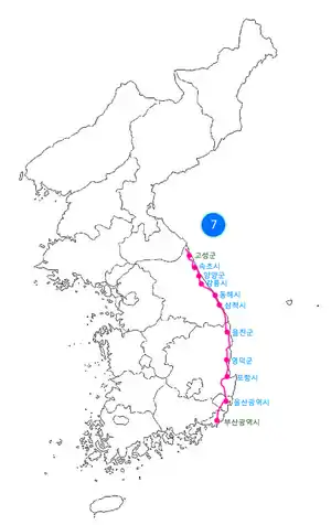 National Route 7 (Korean: 국도 제7호선; RR: Gukdo Je Chil(7) Hoseon) is a national highway in South Korea. It connects Busan with Goseong in Gangwon Province. Before the division of the Korean Peninsula, the highway ran until Onsong, North Hamgyong Province, in present-day North Korea.