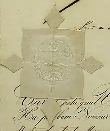 The use of seal in official documents derives from the Empire of Brazil, in which the stamp in relief stamp in the shape of the imperial coat of arms was used. This was packed in a wrapper and commonly made with sayings in Latin or in Portuguese about the emperor, for example: "Pedro II, Constitutional Emperor of Brazil" or "Pedro II - perpetual defender of Brazil". the seal of the imperial era was created by the ministerial notice signed by Luís Pereira da Nóbrega de Sousa Coutinho on October 24, 1822.[1]