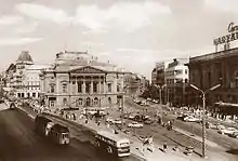 The National Theatre building was demolished in the 1900s. The company moved to the People's Theatre at Blaha Lujza Square in 1908. In the following decades, the company was only a tenant of People's Theatre, and the building's state continually deteriorated. In 1963, authorities decided to demolish it, citing metro line construction as the reasoning.[2] Operation ceased one year later, and the building was demolished on April 23, 1965. The company transferred to the renovated Petőfi Theatre (today is known as Thália), in Nagymező Street. Two years later, it relocated again to the former Magyar Theatre in Hevesi Sándor Square.