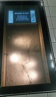 Showcases in the city Under the heading "Verdammt lang her …" ("long long ago"), the museum shows casts of centerpiece objects in underground stations of the Bielefeld Stadtbahn. The installation was realised in 2006 when the museum celebrated its 100-year anniversary. Showcases in the floor of the stations show casts of fossils such as the temnospondyl Cyclotosaurus buechneri, the ichthyosaur Temnodontosaurus or the Woolly rhinoceros. Large size banners supplement the installation. A drilling core from the time when the subway tunnel was built is shown next to an elevator in one underground station and illustrates the strata of 220 million years of earth history in Bielefeld.[6]