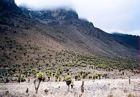 The two giant groundsel species, Dendrosenecio keniodendron and Dendrosenecio keniensis are separated by altitude and topography. D. keniodendron occurs more frequently with increasing elevation above 3,900 metres (12,800 ft) and up to 4,500 metres (14,800 ft),[16] whereas D. keniensis occurs mainly below 4,000 metres (13,100 ft) and very rarely above 4,200 metres (13,800 ft). At intermediate elevations, D. brassica occurs mainly on the wetter valley bottoms, and D. keniodendron mostly on the drier slopes. Where the two species come in close proximity, hybrids are not uncommon.[15]