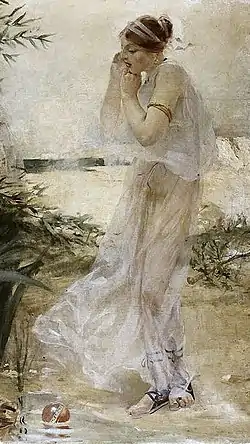 Next follows the characteristic scene of the emergence of Aethon (originally Odysseus) from the sea; Nausicaa's maids are washing clothes at a spring by the seashore when the shipwrecked Aethon emerges from the waters and asks them for shelter. Taking his sudden appearance as the goddess Athena's response to her plea for help, Nausicaa decides to take Aethon to the palace, disguising him as a beggar.