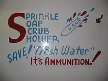 A Navy shower (also known as a "combat shower", "military shower", "sea shower", "staggered shower", or "G.I. bath") is a method of showering that allows for significant conservation of water and energy by turning off the flow of water in the middle portion of the shower while lathering. The total running time of this kind of shower can last less than two minutes – using an initial thirty seconds or so to get wet, followed by shutting off the water, using soap and shampoo and lathering, then rinsing for a minute or less.[1]