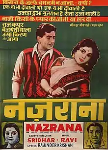 Nazrana (transl.Gift) is a 1961 Indian black-and-white Hindi-language melodrama film produced by S. Krishnamurthy and T. Govindarajan and directed by C. V. Sridhar in his Hindi directorial debut. The film stars Raj Kapoor, Vyjayanthimala, Usha Kiran in love triangle, while South Star Gemini Ganeshan has an extended cameo appearance.[1] The music is by Ravi. The Mohammed Rafi song "Baazi Kisi Ne Pyar Ki Jeeti Ya Haar Di", which was picturised on Raj Kapoor and it was one of the popular sad songs of that era.