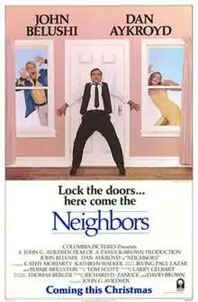 Neighbors is a 1981 American black comedy film based on the novel of the same name by Thomas Berger. It was released through Columbia Pictures, was directed by John G. Avildsen, and starred John Belushi, Dan Aykroyd, Cathy Moriarty, and Kathryn Walker. The film takes liberties with Berger's story and features a more upbeat ending. The screenplay of the film is officially credited to Larry Gelbart, although it was extensively rewritten to Gelbart's public disapproval. Released two and a half months before Belushi's death, the film marks his last film performance.