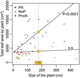 Left: Relationship between total foliar area and plant height in ant-inhabited specimens (PA), pitchering specimens lacking ants (PnoA), and non-pitchering specimens (NoP). The highlighted value of 175 cm indicates the approximate height at which plants transition from a self-supporting stem with lower pitchers (filled points) to a climbing one with upper pitchers (empty points).[5]