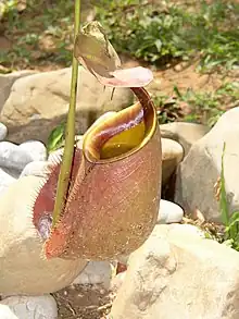 The two thorns that give N. bicalcarata its name are unique to this species and bear some of the largest nectaries in the plant kingdom.[21][22][23] The purpose of these structures has long been debated among botanists. Frederick William Burbidge suggested that they might serve to deter arboreal mammals such as tarsiers, lorises and monkeys from stealing the contents of the pitchers.[11][24] In an article published in 1982, Cliff Dodd speculated on the function of the thorns, but did not believe they play a role in prey capture.[25] Charles Clarke observed that monkeys and tarsiers rip the pitchers open at the sides in order to feed from them, rather than reaching in through the pitcher mouth.[26] However, he found that the mammals attacked the pitchers of N. bicalcarata less frequently than those of other species, such as N. rafflesiana.[26] Clarke's observations suggest that the spines likely serve to lure insects into a precarious position over the pitcher mouth, where they may lose their footing and fall into the pitcher fluid, eventually drowning.[26] A similar trapping method is employed by the Sumatran endemic N. lingulata, which has a single filiform appendage positioned over the pitcher mouth. However, in that species the appendage is a structure of the lid and not the peristome.[27]