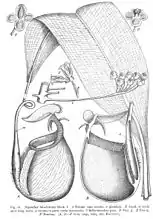Right: Upper pitcher and part of male inflorescence of N. dyak, from Moore's 1880 description[3]