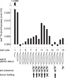 Centre: Nitrogen flux from C. schmitzi colonies to an N. bicalcarata host plant (c. 1.4 m diameter). The bars show the change in 15N concentration in the host plant's leaves two weeks after a pulse of 15N was fed to the associated C. schmitzi colonies. Leaf node 1 has the youngest (still developing) leaf, with the others numbered sequentially as one moves down the stem. The pictograms below the graph show the state of each leaf and pitcher, and indicate the presence or absence of C. schmitzi and whether a 15N pulse was administered.[44]