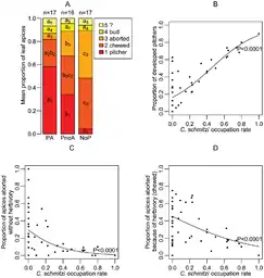 Right: A: Isotopic signatures (δ15N) of C. schmitzi, ant-occupied plants (PA), and unoccupied plants with no evidence of previous colonisation (PnoA-no hole). B: Relationship between C. schmitzi occupation rate and plant foliar δ15N.[5]