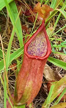 Rosette and lower pitchers are either wholly ovate or ovate in the basal half of the pitcher cup and narrower above. They measure up to 15 cm in height by 5 cm in width. The hip is usually located near the middle of the pitcher, but may be completely absent in entirely ovate traps. A pair of wings (≤12 mm wide) runs down the ventral surface of the pitcher cup, bearing narrow fringe elements. The pitcher mouth is smoothly triangular and has an oblique insertion. The peristome is flattened and up to 10 mm wide, with teeth up to 1 mm long. The extent of the glandular zone of the inner surface is variable, ranging from one-third to two-thirds of the pitcher's height. The pitcher lid or operculum is broadly to narrowly ovate. It has a slightly cordate base and is often irregularly wavy at the margins. It measures up to 4.5 cm in length by 3.5 cm in width, being as large as or smaller than the pitcher orifice. The lower surface of the lid does not have any appendages, but bears numerous crater-like glands (≤1 mm in diameter), the largest of which are located around the midline. A small depression is also present on the lower surface of the lid, near the apex. An unbranched spur (≤5 mm long) is inserted near the base of the lid. On their outer surface, terrestrial pitchers are typically green to orange with red stripes, or red throughout. Red blotches are present in the waxy zone of the inner surface. The colour of the peristome is highly variable and may be green to orange or red. The lid ranges in colour from orange to red, and bears fine red streaks.[2][4]