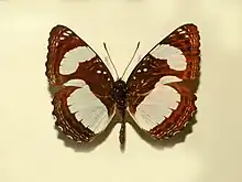 Neptis nicomedes has a wingspan reaching about 40 millimetres (1.6 in). The uppersides of the wings are dark brown. Both wings are crossed in the middle by a broad band of white, followed by a band of indistinct grey spots and by three sub-marginal linear bands of white. The underside is similar to the upperside, but colours are paler.