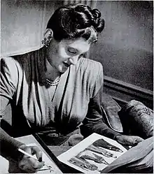 In 1937, Rosenstein was described by Life Magazine as one of the most highly regarded American designers.[2] She was one of the first recipients of the Neiman Marcus Fashion Award on its launch in 1938. In 1940, Rosenstein clothing was sold out of 92 shops and department stores across the USA, at prices ranging from $98 to $500.[4] Whilst these prices were beyond the range of most consumers, Rosenstein's designs were so widely copied that she still influenced the average American woman's wardrobe.[4] One such design was the "little black dress" designed to go from day to evening with low-cut evening necklines combined with daywear silhouettes and materials.[2][4] Nettie Rosenstein designs also included printed dresses with gloves to match, and she was also known for her accessories and striking costume jewelry.[2] Many of the more striking Nettie Rosenstein garments were designed by Eva Rosencrans as Rosenstein preferred to focus her attention on running the business, and her sister-in-law was happy to let Nettie take credit for her work.[5]
