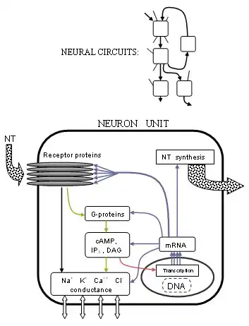 Abstract simplified diagram showing overlap between neurotransmission and metabolic activity. Neurotransmitters bind to receptors which cause changes to ion channels (black, yellow), metabotropic receptors also affect DNA transcription (red), transcription is responsible for all cell proteins including enzymes which manufacture neurotransmitters (blue).