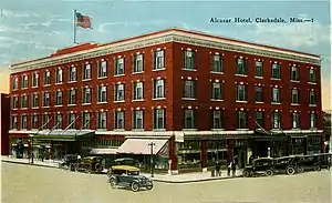 The original Alcazar Hotel was built in 1895; it was destroyed by arson caused by a former employee in 1947.[2] The new hotel was built by the architect Charles O. Pfeil of Memphis, and was completed by 1915. Billed as the "most modern hotel in Mississippi", it had a glass dome skylight and was more spacious than the original.[3] The building had four stories, with eleven storefront bays where prominent Clarksdale businesses operated.[4] The hotel was remodeled in 1938 to include a private bath in each room. Around 1948, a mezzanine level was introduced between the first and second floors.[2]