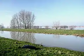 The area between the two Bedford Rivers, 20 miles (32 km) long and 1,070 yards (980 m) wide at their greatest separation near Welney,[11] is below the rivers and below sea level, and is frequently flooded during winter. There is a sluice at Earith which is used to control the waters of the River Great Ouse. It was built with nine openings in 1637, but was subsequently rebuilt with seven openings in 1824, and again with three openings in 1954. When flows in the upper river are normal, the sluice gates are closed, and most of the flow is routed along the tidal New Bedford River. As flows increase, the sluices are opened, and water flows along the Old Bedford River, which progressively floods the 8.9 square miles (23 km2) of washlands which comprise the Ouse Washes.[12] At Welney, these washes provide an ideal habitat for wildfowl and other birds, and the Wildfowl and Wetlands Trust has established a nature reserve here, the WWT Welney. The reserve occupies 990 acres (400 ha), and is accessible from the A1101 bridge by following a minor road to the carpark, and then crossing the New Bedford River by a footbridge. It is important for its wild flowers, dragonflies and butterflies, as well as the birds, which are most numerous when the washland is flooded.[13]