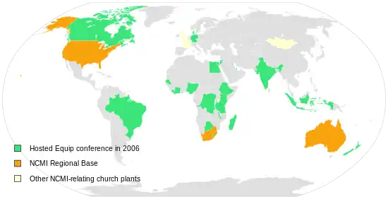 In 2006, Equip conferences were hosted in 33 countries, covering North America, South America, Europe, the Middle East, sub-Saharan Africa, and southeast Asia.[53][note 5]