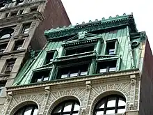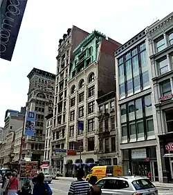 The eight-story brick and masonry building has been described as a "gem" and a "gorgeous example" of Art Nouveau architecture.[2] Eschewing the then-popular Beaux Arts style, this is one of the few and possibly the earliest Art Nouveau building in Manhattan still standing.[3] Four squat rounded Doric columns seem to support five stories with three vertical rows of large windows separated by brickwork and iron ornamentation, culminating in three large arches at the sixth floor. This is topped with a two-story copper fronted mansard roof, now coated with verdigris, reminiscent of Parisian architecture.[4][5] The 90,000-square-foot (8,400 m2) building is served by a freight elevator and two passenger elevators. Average floor size is 10,000 square feet (930 m2).[6] The building goes through the block west of Broadway so that it also fronts on Mercer Street, which is parallel to Broadway.