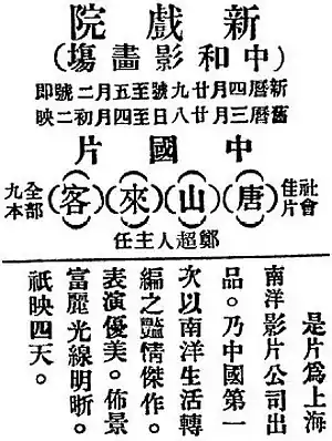 The silent film New Friend (新客) is a melodrama about a newly arrived Chinese immigrant to Singapore. It was first screened in Singapore at the Victoria Theatre (維多利亞戲院) on 4 March for a public test,[2] entertained more than 500 guests, just showed 6 reels of film, two erotic dances (Chinese sword dance and Malay butterfly dancer) were also shown in the showed film.[3] Its official premiere was at Marlborough Pub and Theatre (曼舞羅戲院) on Beach Road (小坡海墘十二間), and Gaiety Picture Place (牙池電影戲), the cinema was located in front of a Chinese temple - "(太師公廟)", the junction between Albert Street (芒果律) and Bencoolen Street (小坡五馬路), Singapore. After public showing in Singapore, it was reported that it used another Chinese film title as "(唐山來客)", released in the "Chung Wo Cinema (中和影畫場)" in Kau U Fong (九如坊), Hong Kong, from 29 April 1927, Friday to 2 May 1927, Monday, totally four days, so it is the first film production of Singapore, and the first export film production too.[4]